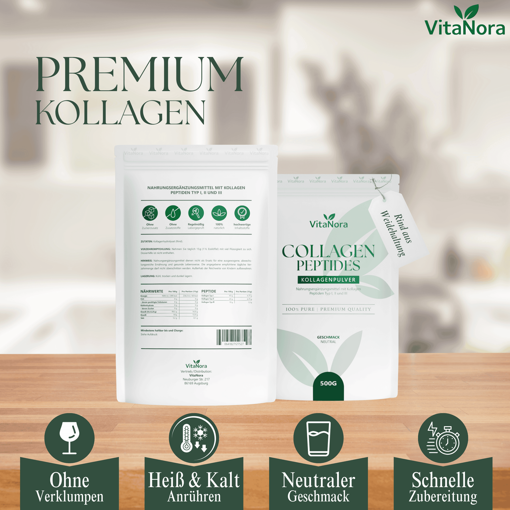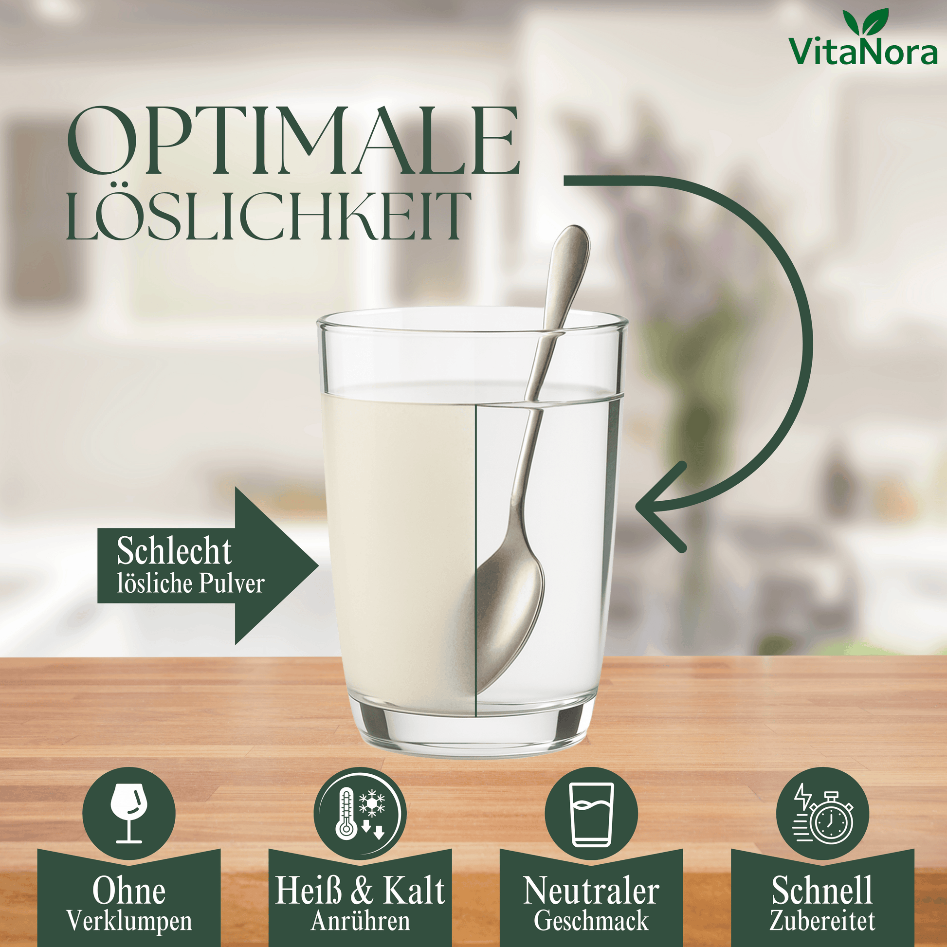 Das VitaNora Kollagenpulver enthält hochreine, hydrolysierte Kollagenpeptide der Typen I, II & III und lässt sich vielseitig in den Alltag integrieren.