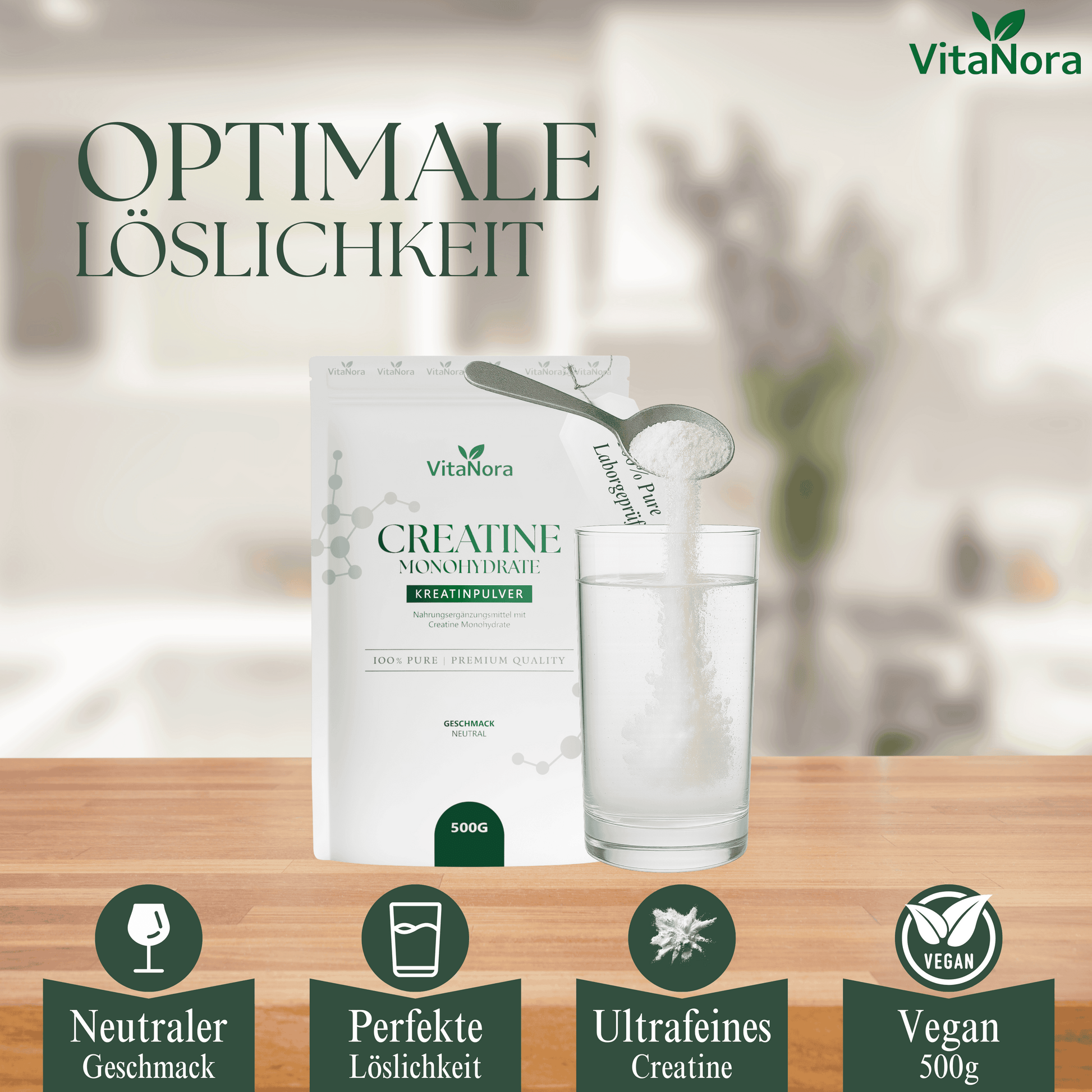 Das Creatine Monohydrate von Vita Nora ist ein reines, hochwertiges Nahrungsergänzungsmittel, das die Energieversorgung der Muskeln bei intensiven Belastungen unterstützt. Es fördert die Steigerung von Kraft und Leistungsfähigkeit sowie eine schnellere Regeneration. Dadurch ist es ideal für Sportler und Fitnessbegeisterte, die ihre Muskelentwicklung und Trainingsfortschritte gezielt optimieren möchten. Die gute Löslichkeit sorgt für eine effiziente Aufnahme und gleichbleibend hohe Wirksamkeit.